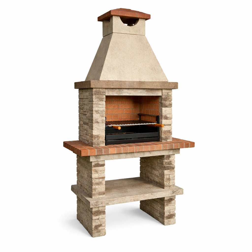 Materiales: Construida con piedra natural y ladrillos refractarios, con detalles en mármol. Adecuada para uso en exteriores.