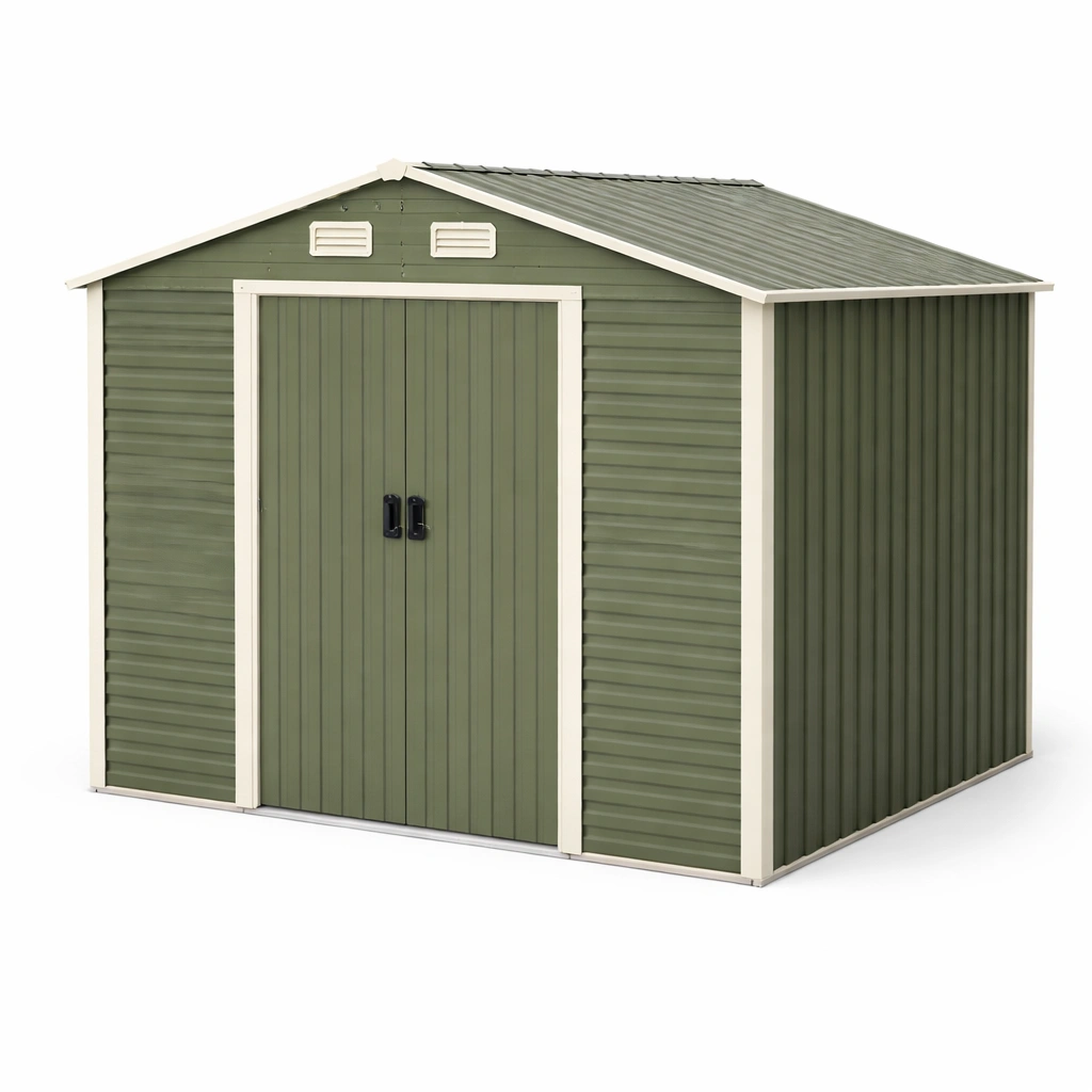 Este cobertizo de jardín está fabricado con chapa de acero galvanizado, ofreciendo una estructura resistente y duradera. Sus dimensiones son de 213 cm de longitud, 130 cm de anchura y 173 cm de altura. Presenta un diseño de techo a dos aguas con ventilación superior para una mejor circulación del aire. Se compone de una estructura metálica con una puerta doble con cerradura. Color predominante: Verde con detalles en Crema. Asegúrese de instalarlo sobre un suelo firme y manipular las piezas con cuidado.